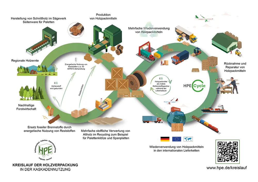 Sehen Sie sich hier im Überblick an, wie die Holzverpackung ihren nachhaltigen Lebenszyklus durchläuft: